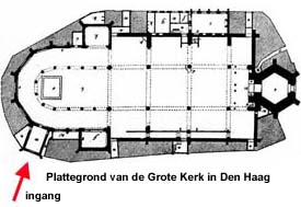 Ik kwam de Grote Kerk binnen bij de ingang met de rode pijl op de plattegrond hiernaast te zien. Je kwam dan binnen bij het priesterkoor, waar in de Rooms-Katholieke tijden